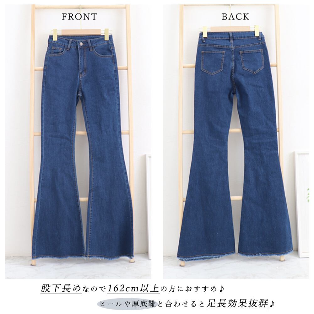 デニム フレアパンツ 裾フリンジ 美脚 ストレッチ ジーンズ 着やせ カットオフ ロングパンツ 春夏秋冬
