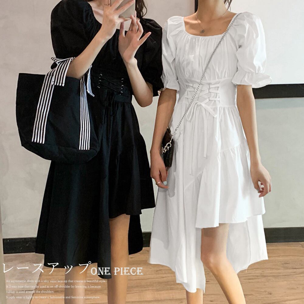 ウエストレースアップ ワンピース風 オフショルダーワンピ 体型カバー フレアワンピ スクエアネック