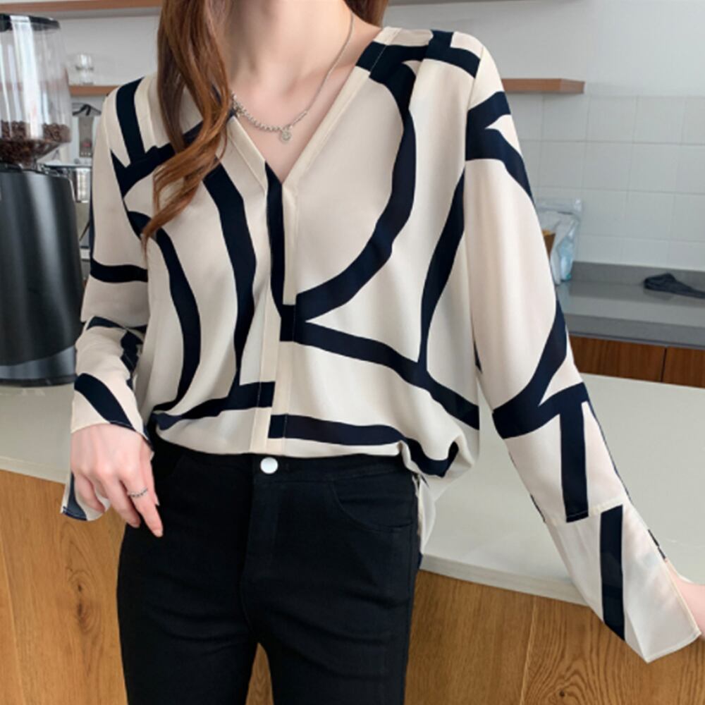 幾何学模様ブラウス Vネック 長袖 サイドスリット ブラウス プルオーバー ゆったり 着やせ レトロ カジュアル