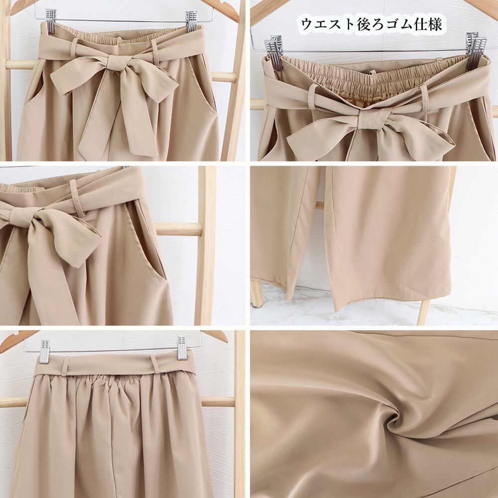 大人可愛い リボン ストレートパンツ ゆったり 無地ボトムス タック オフィスカジュアル ガウチョパンツ 体型カバー春夏