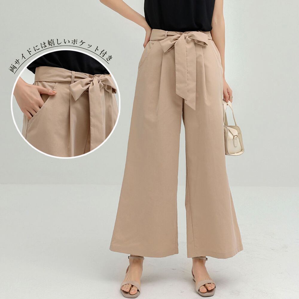 ワイドパンツ クロップド丈 リボン ストレートパンツ ゆったり 無地ボトムス タック ガウチョパンツ