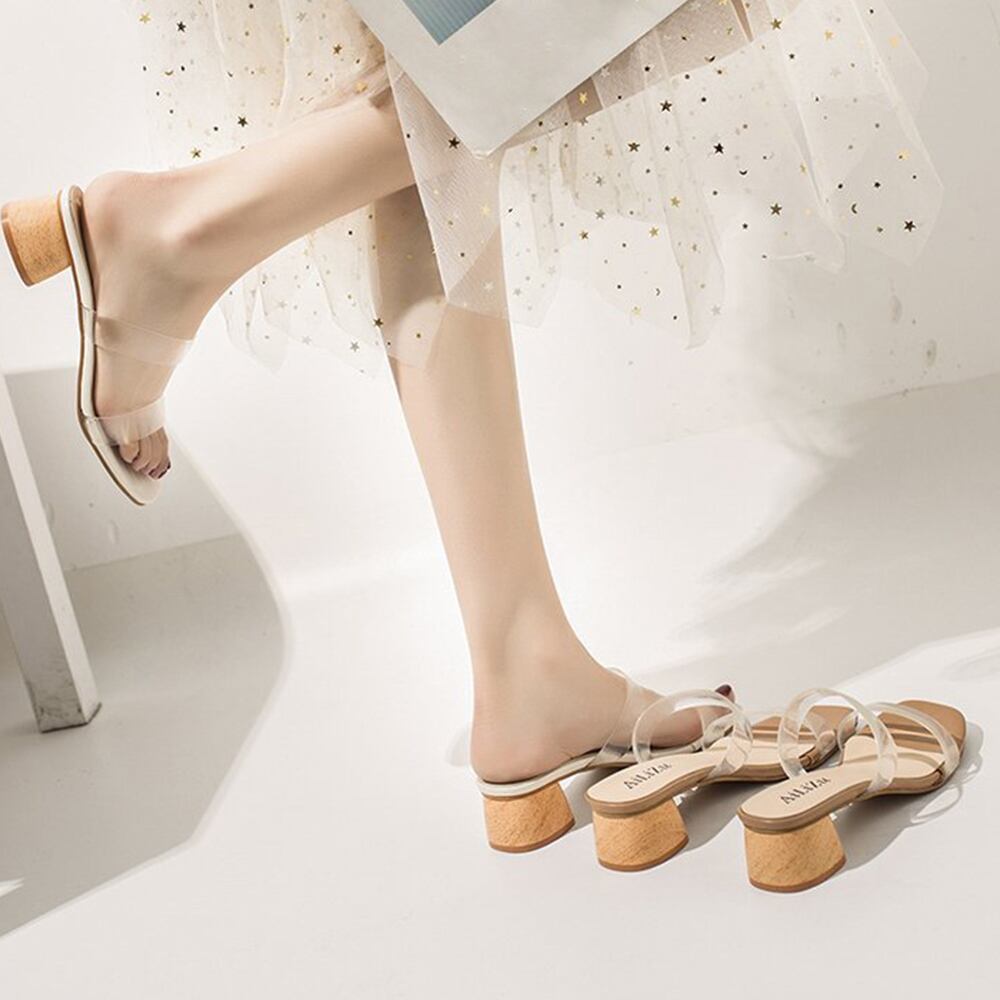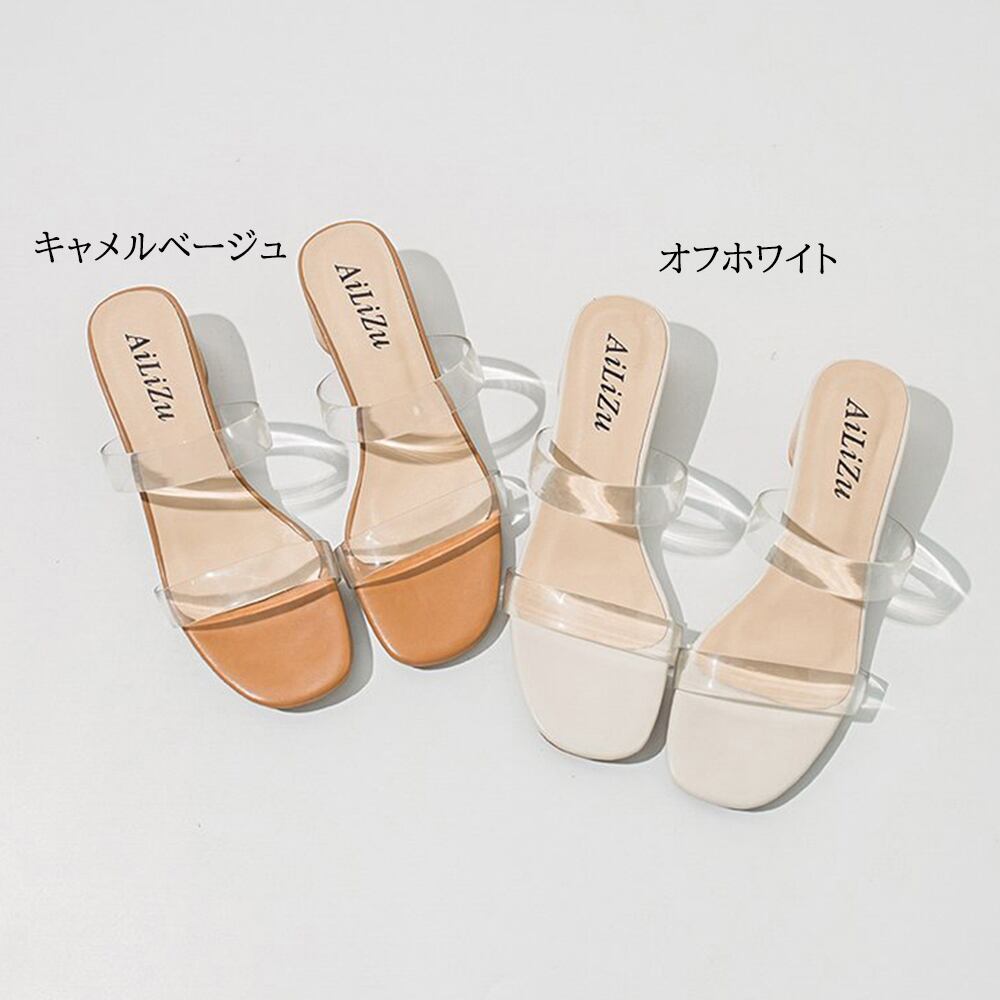 ダブルベルトサンダル クリア チャンキーヒール サンダル スクエアトゥ サマーサンダル 履きやすい ミュール 美脚