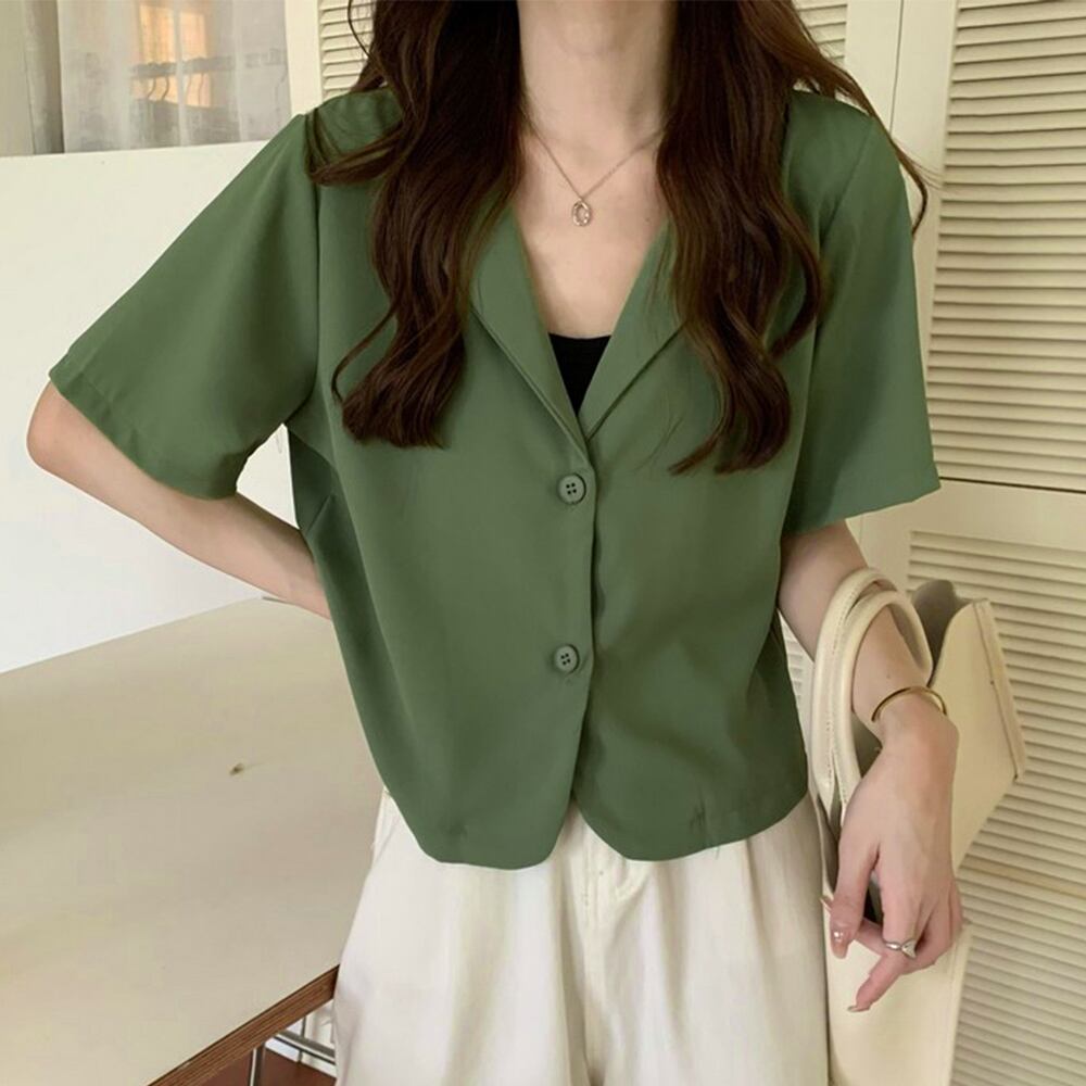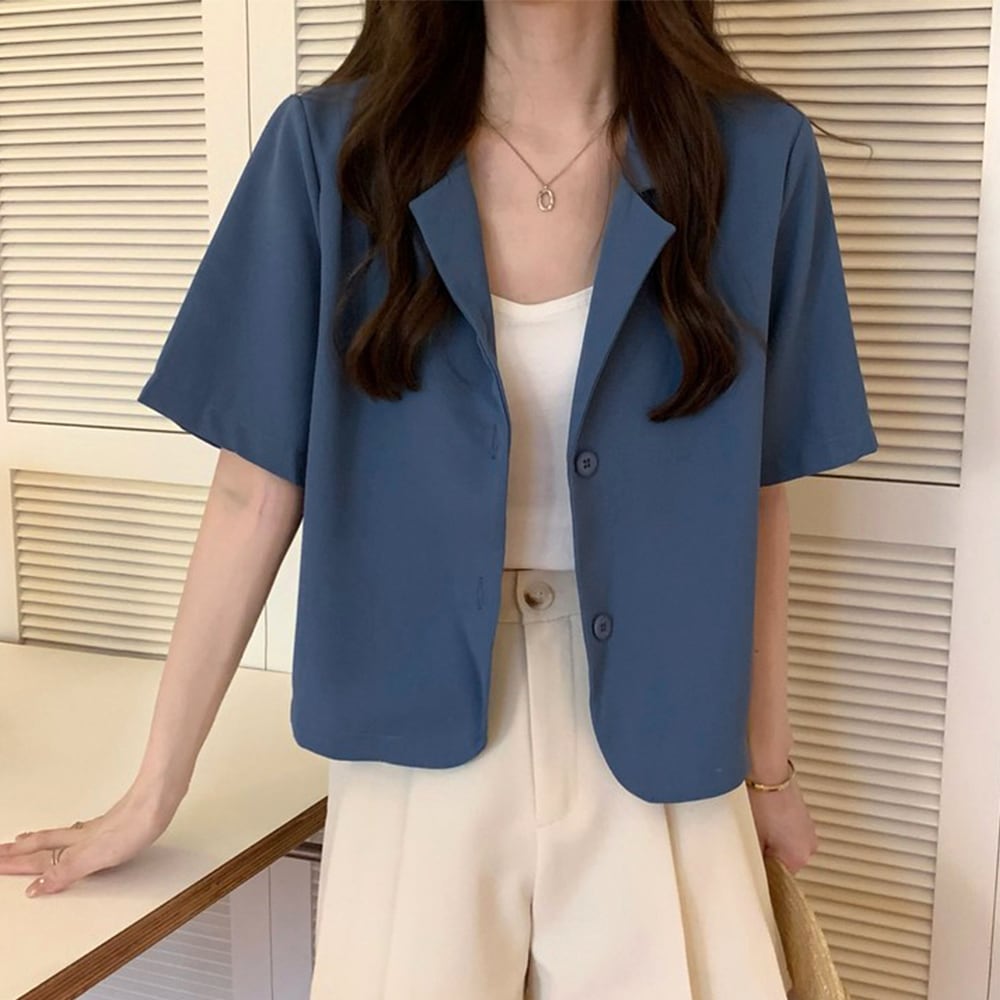 ベーシッククロップド丈 半袖ジャケット アウター Vネック 襟付き 細見え シャツ 5分袖 テーラードジャケット デコルテ