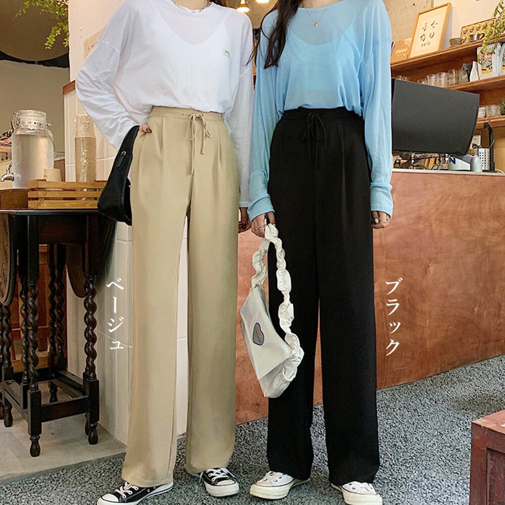ストレートパンツ 美脚 セミワイドパンツ ハイウエスト スーツパンツ ロングパンツ 薄手 ウエスト紐調節