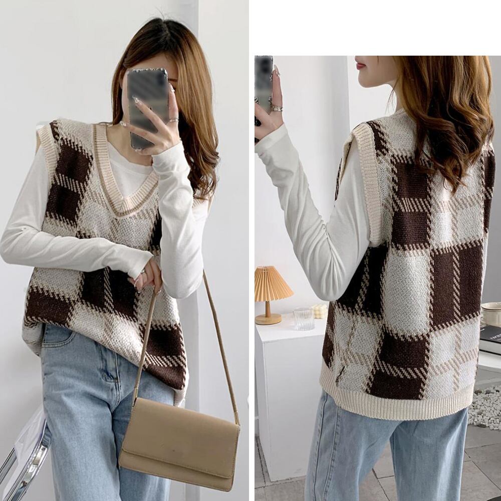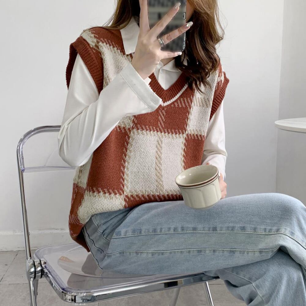チェック柄 ニットベスト Vネック 総柄ベスト レディース ニットチョッキ 重ね着 レイヤード風 ニットカットソー プルオーバー