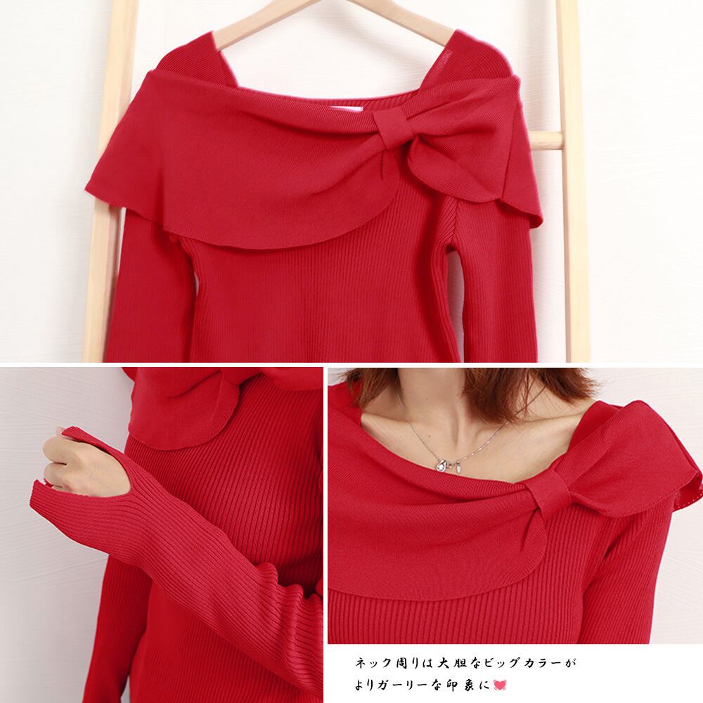 ビッグリボン ニットトップス ビッグカラー リブニット スクエアネック デコルテ見せ ニットウェア ニットソー