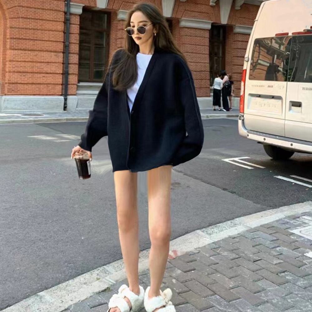vネック ニットアウター ドロップショルダー カジュアル 羽織り コーディガン 大人コーデ 楽ちんアウター黒 着やせ