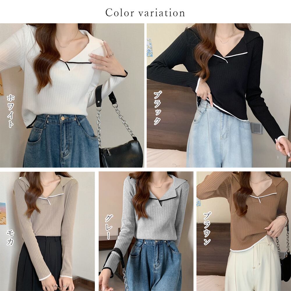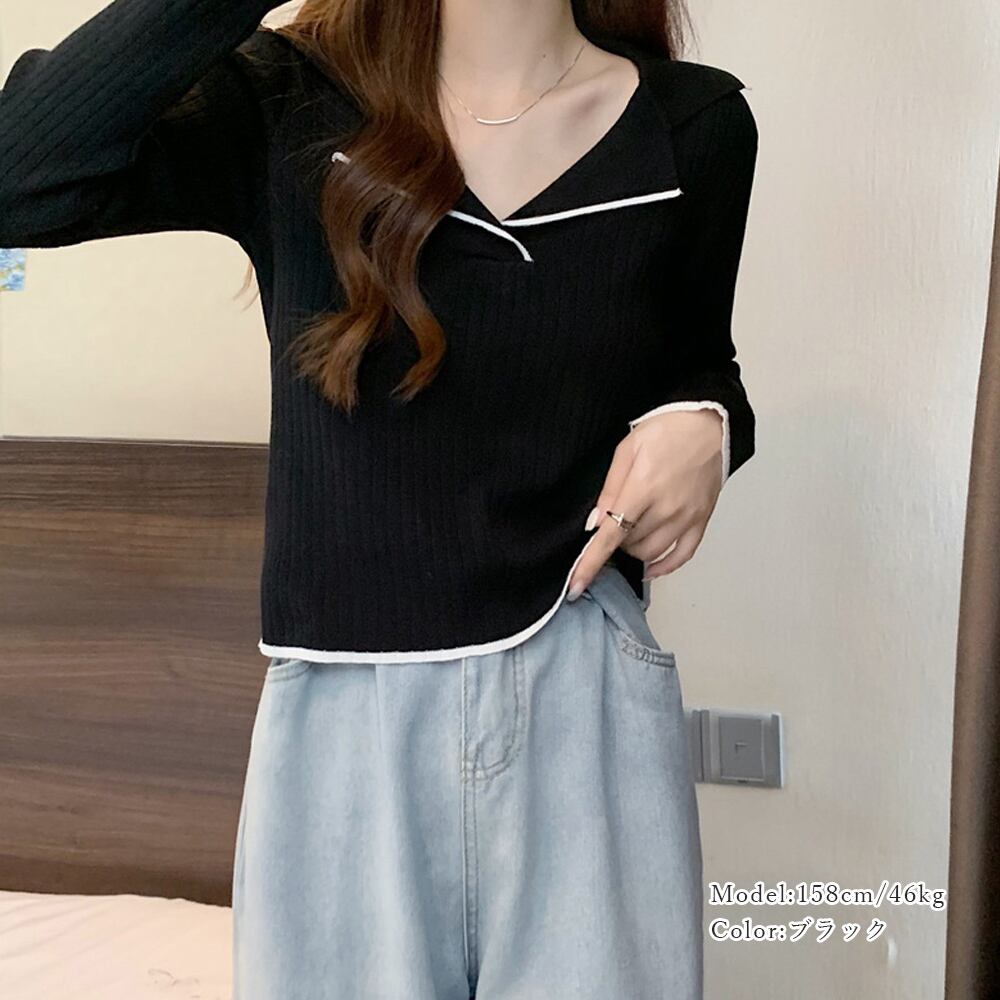 ポロニットトップス バイカラー ニットセーター ニットウェア 着やせ 配色 ニットソー 長袖 リブニット