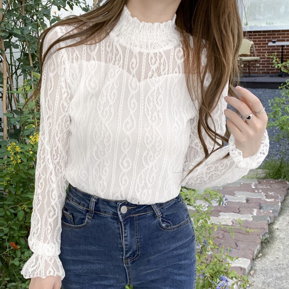 レース ブラウス プチハイネック 重ね着 フリル シアートップス レディース 裏地付き レイヤードブラウス
