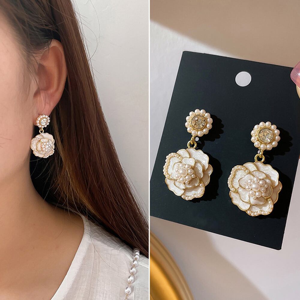 キラキラ輝くラインストーンに大振りの花モチーフ、パールがふんだんに散りばめられたフェミニンピアス