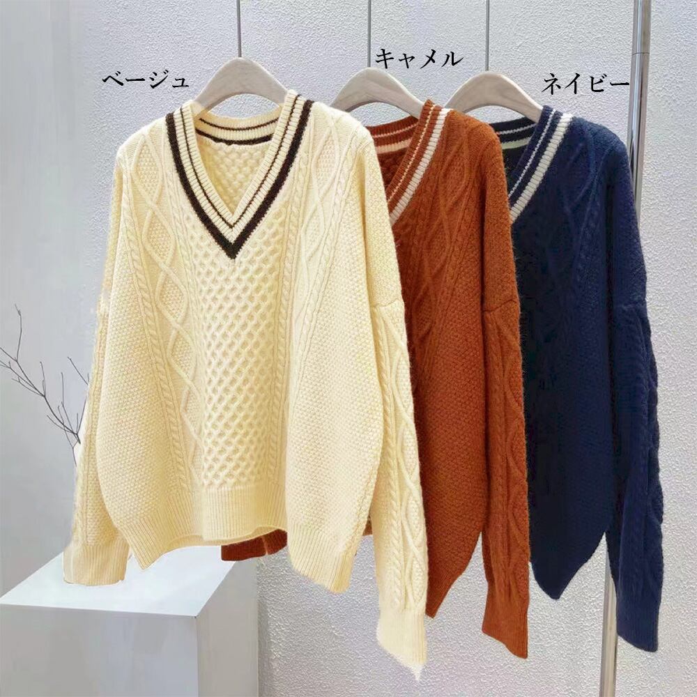 ライン入りケーブルニットトップス ゆったり ニットウェア Vネック カジュアル ニットセーター 体型カバー