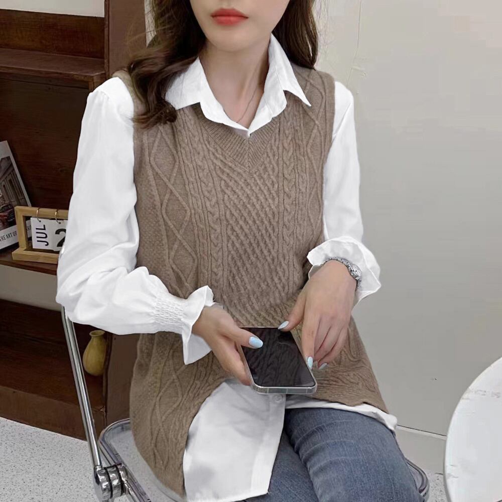 襟付きシャツ 長袖 ニットチョッキ 春秋冬 重ね着