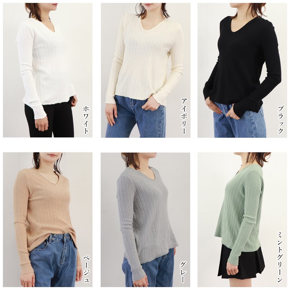 ニットトップス Vネック リブニット レディース ベーシック ニットウエア カジュアル 長袖