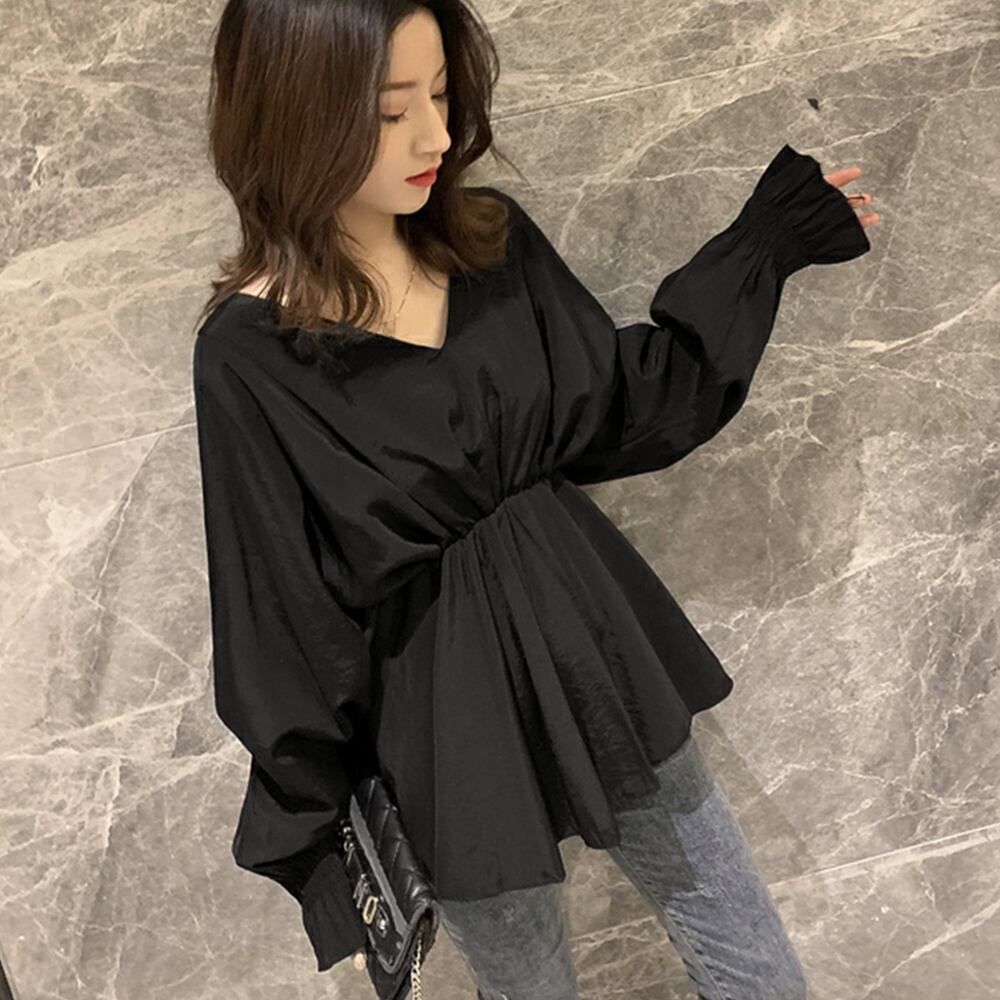 シャツブラウス ボリューム袖 Vネック キャンディースリーブ ペプラム ブラウス 春夏 着やせ 長袖