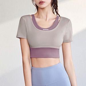 ヨガトップス クロップド丈 バイカラー カップ付き スポーツウェア レイヤード ジムウェア テニス