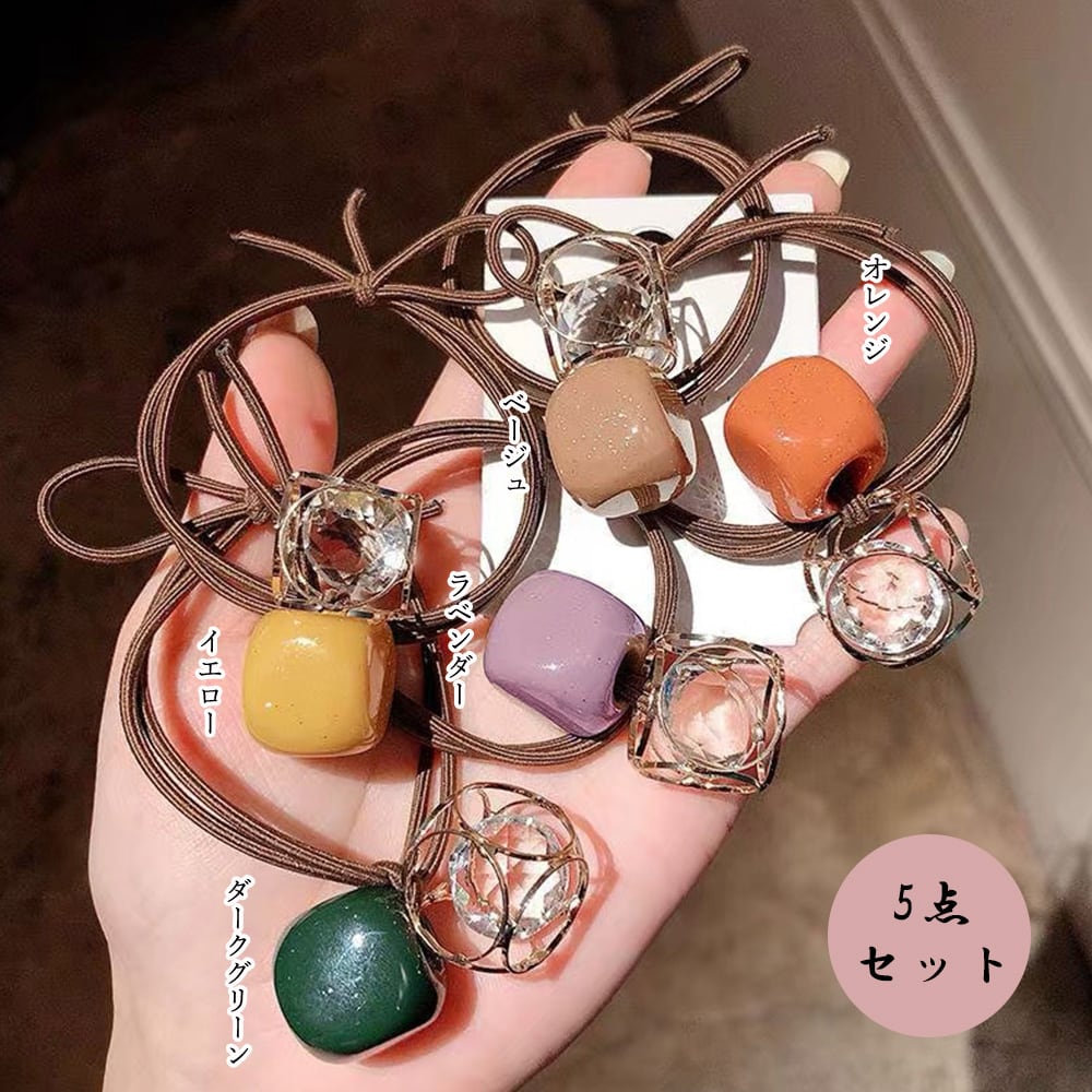 ラインストーンキューブと四角形モチーフの飾りがかわいい、大人な雰囲気漂うヘアゴム5色セット