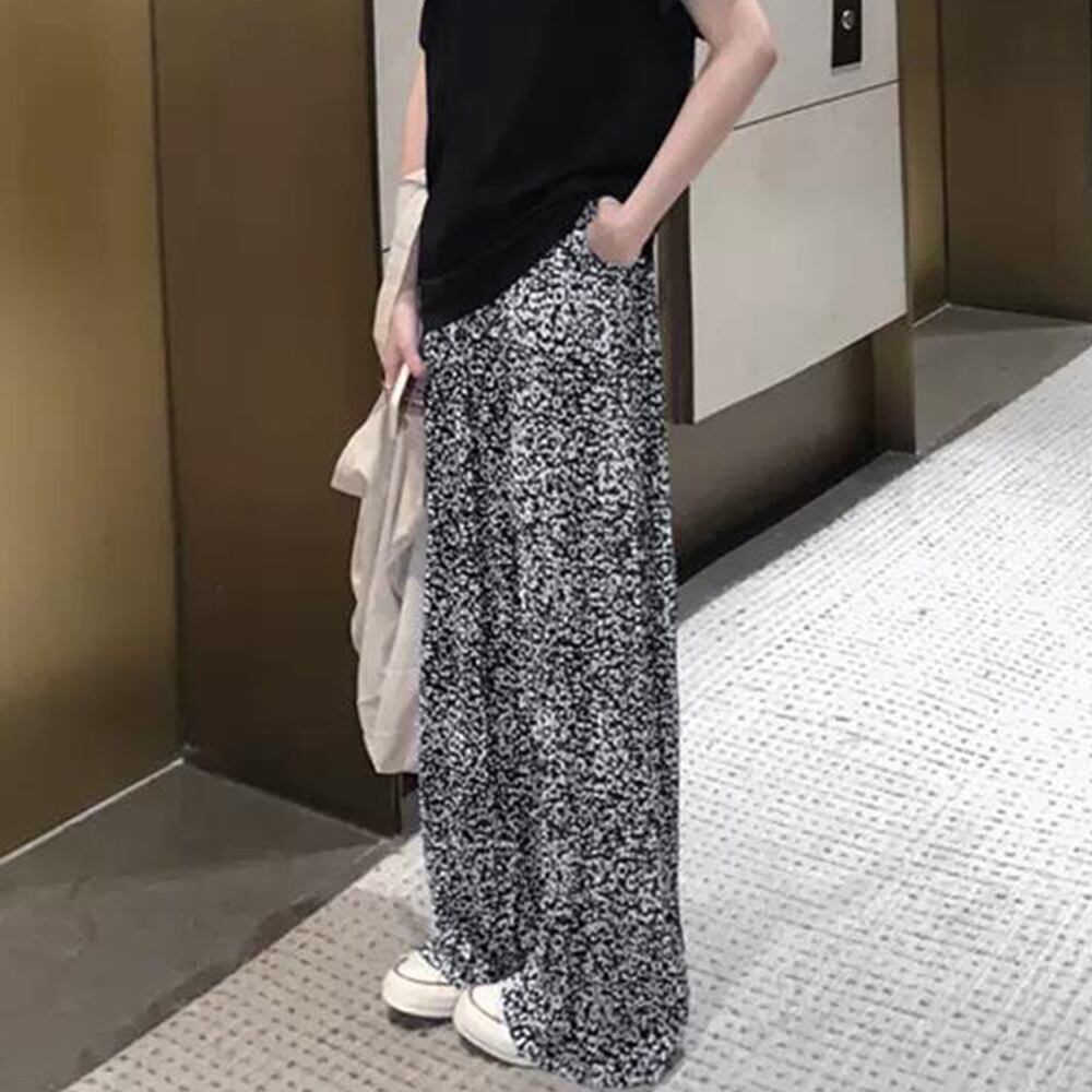ハイウエスト ストレートパンツ カジュアル ロングパンツ リラックス ウエストゴム 着やせ ヒョウ柄パンツ