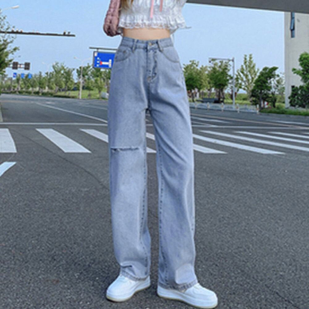 デニムストレートパンツ ダメージジーンス レディース ゆったり デニムワイドパンツ ハイウエスト