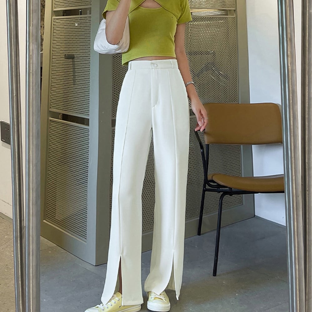 パンツ スラックス フロントスリット 美脚 レディース おしゃれ センタースリット ストレートパンツ