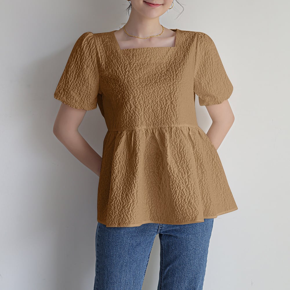 ぽこぽことした凹凸シワ加工を施した生地は独特の風合いがあり、程よいカジュアル感を演出してくれるペプラムブラウスです