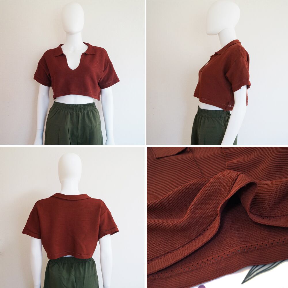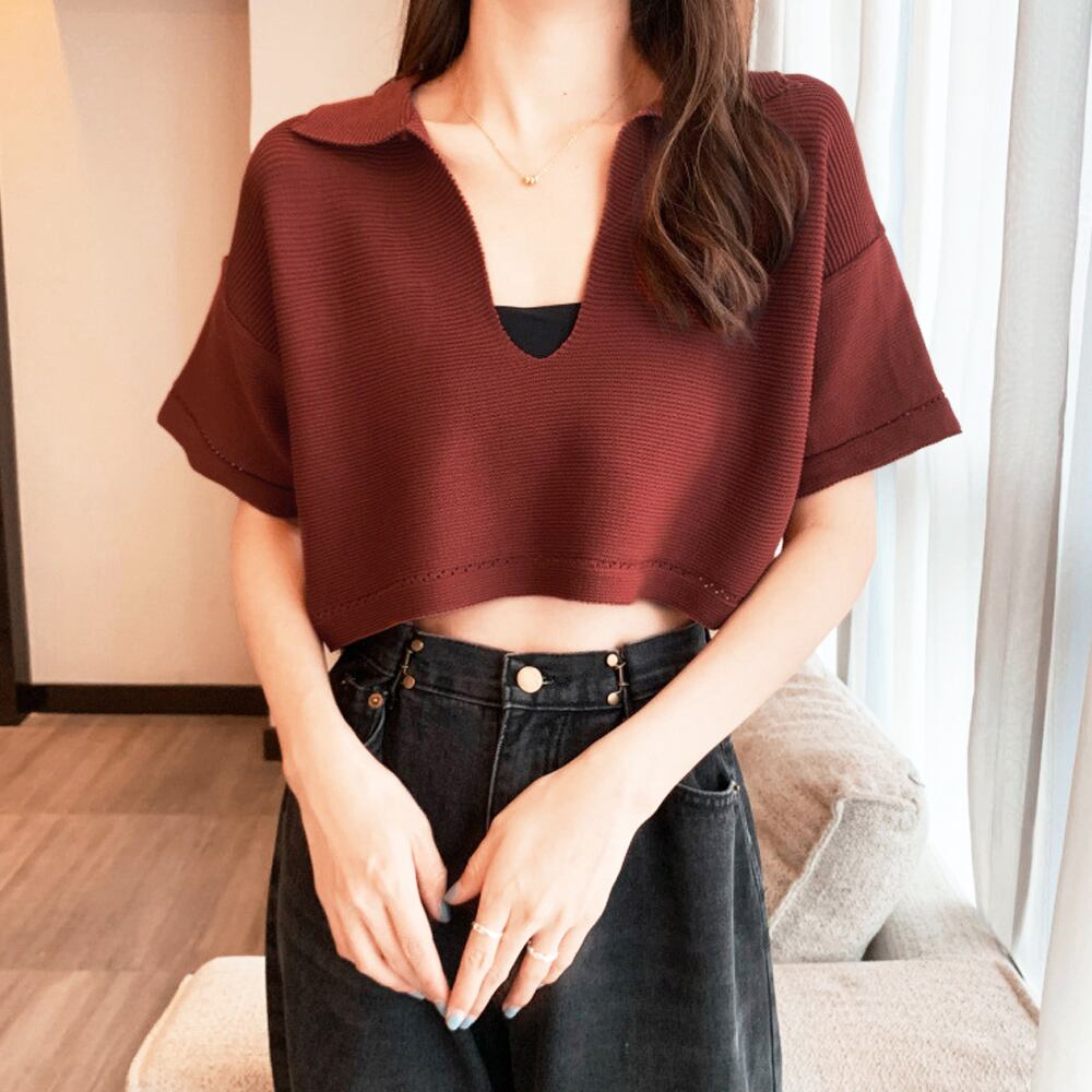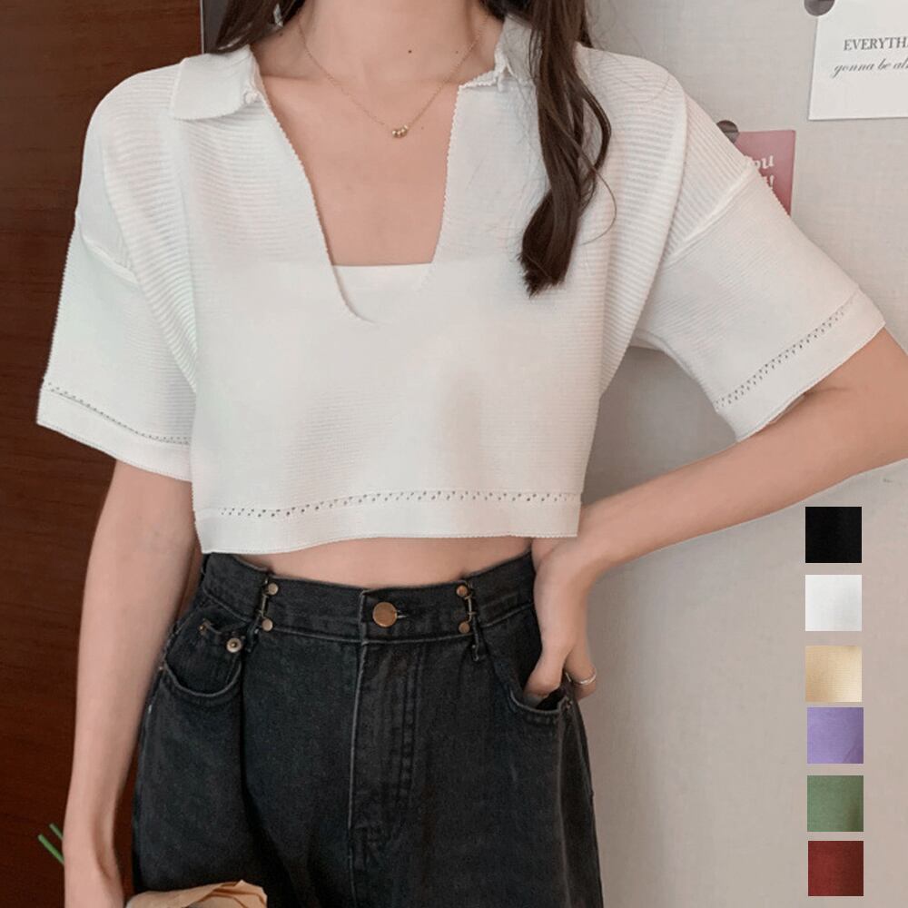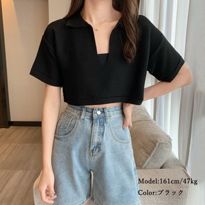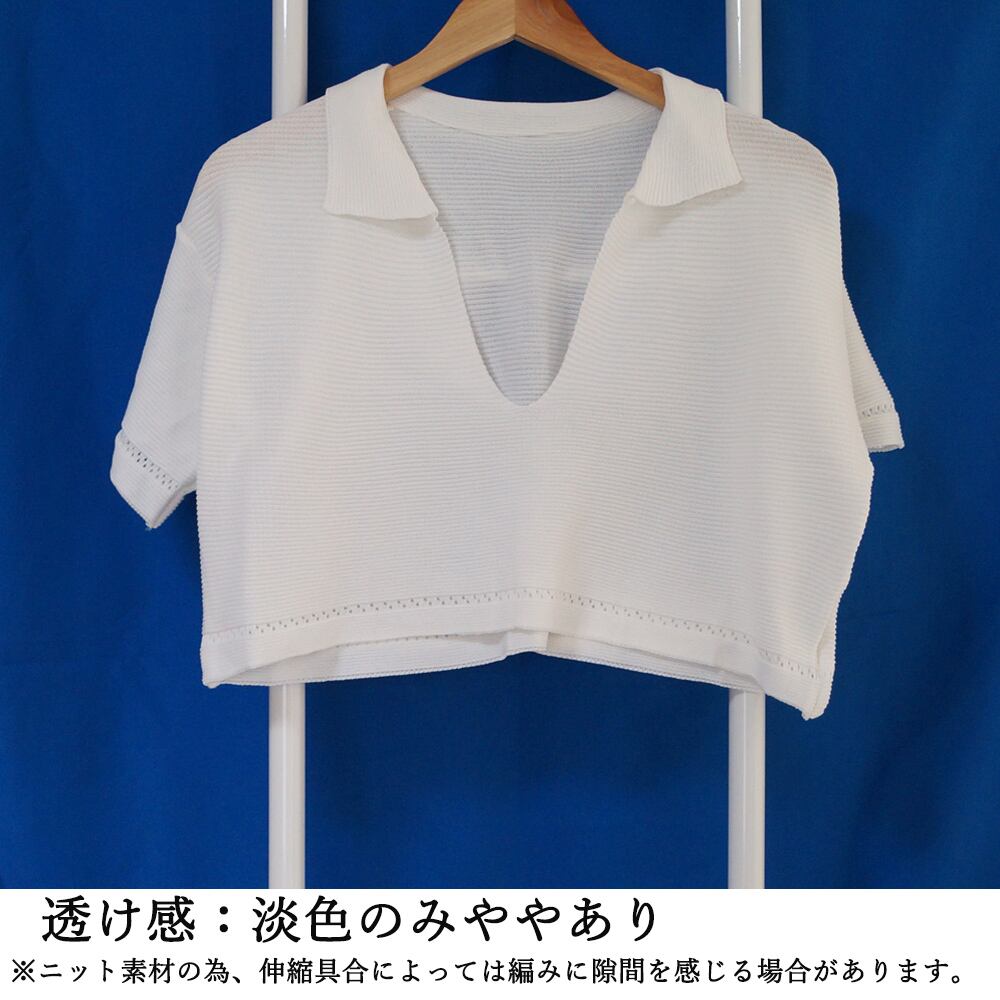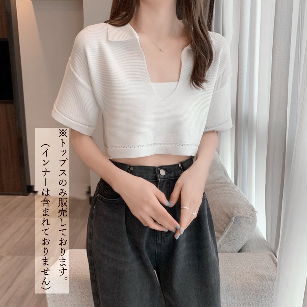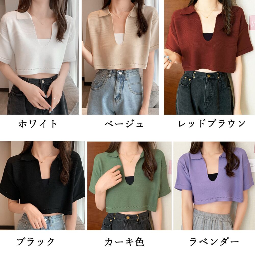 サマーニット へそ出し 半袖 襟付き レディース ショート丈 トップス キーネック ニットソー 春夏