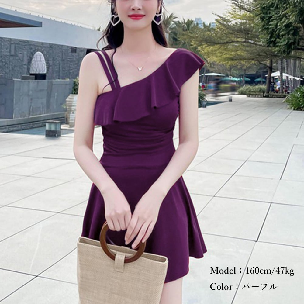 肩まわりのフリルとスカート部分のフレアシルエットがかわいいワンショルダーワンピース水着