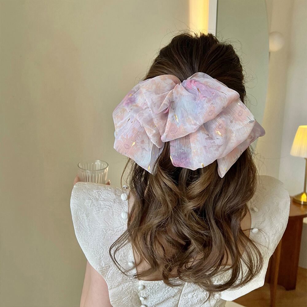 花柄 シフォンバレッタ 大きめリボン 髪飾り 蝶々結び 大人可愛い まとめ髪カジュアル女子会 おしゃれ 流行りタイダイ柄