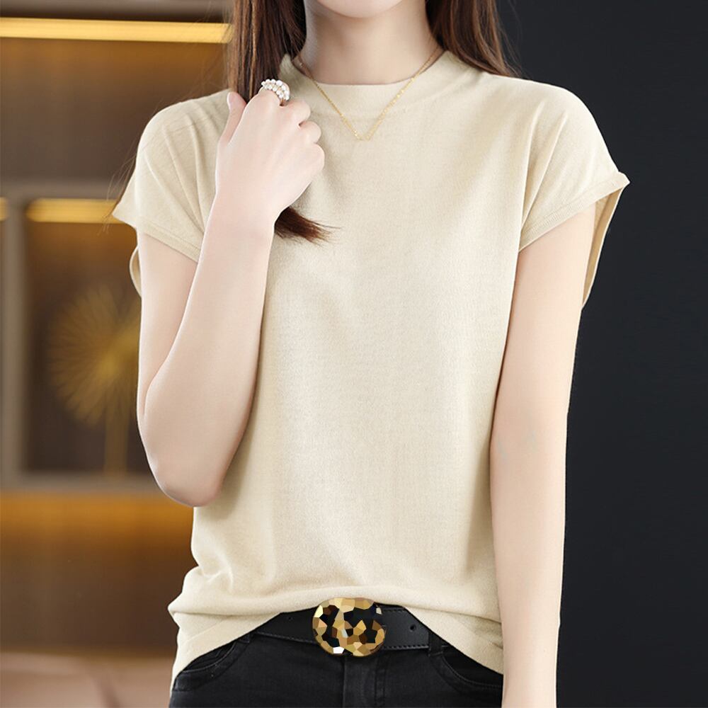 フレンチスリーブ ニットTシャツ 冷感タッチ 着やせ 30代40代通勤服 プチハイネック ニットトップス 春秋夏