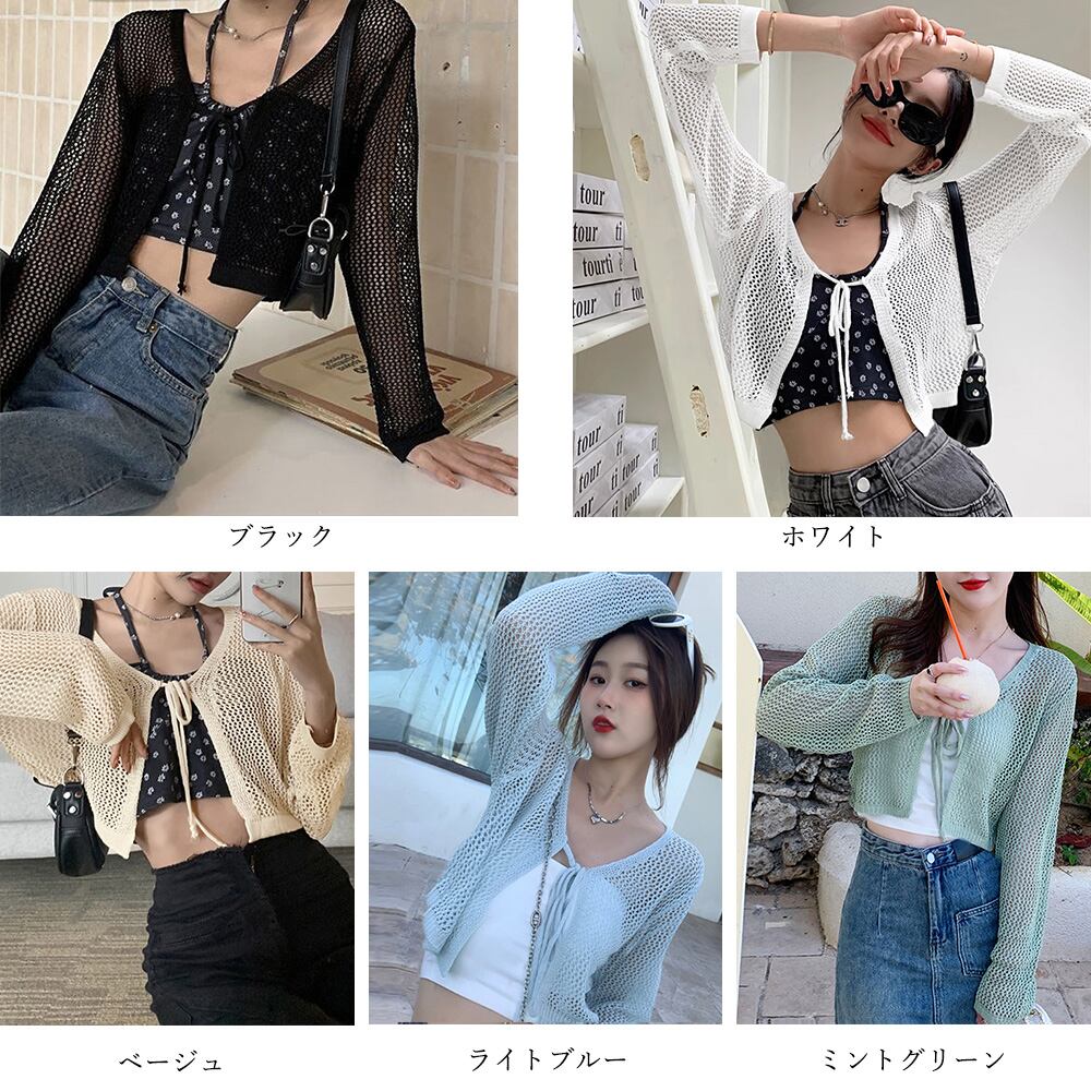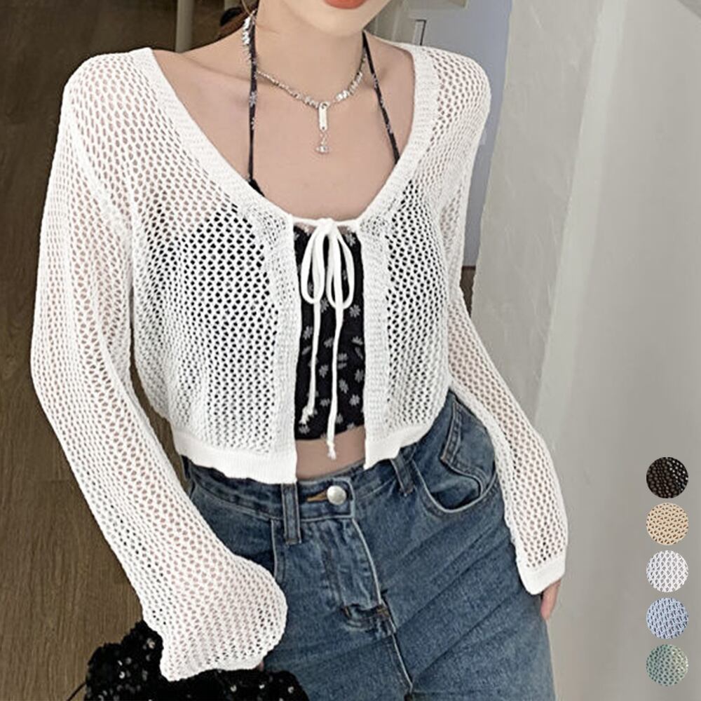 ニットカーディガン 薄手 透かし編み サマーニット 夏トップス 前開き へそ出し お洒落 リボン