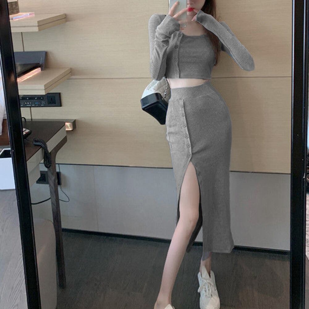 ショート丈 ニットトップス ボタン開きスリット タイトスカート セクシー 2点セット ハイウエスト サイドボタンスカート
