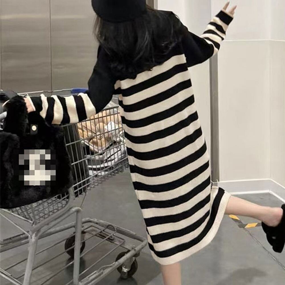 ボーダー ワンピース Vネックニット ドロップショルダー ニットワンピース きれいめカジュアル