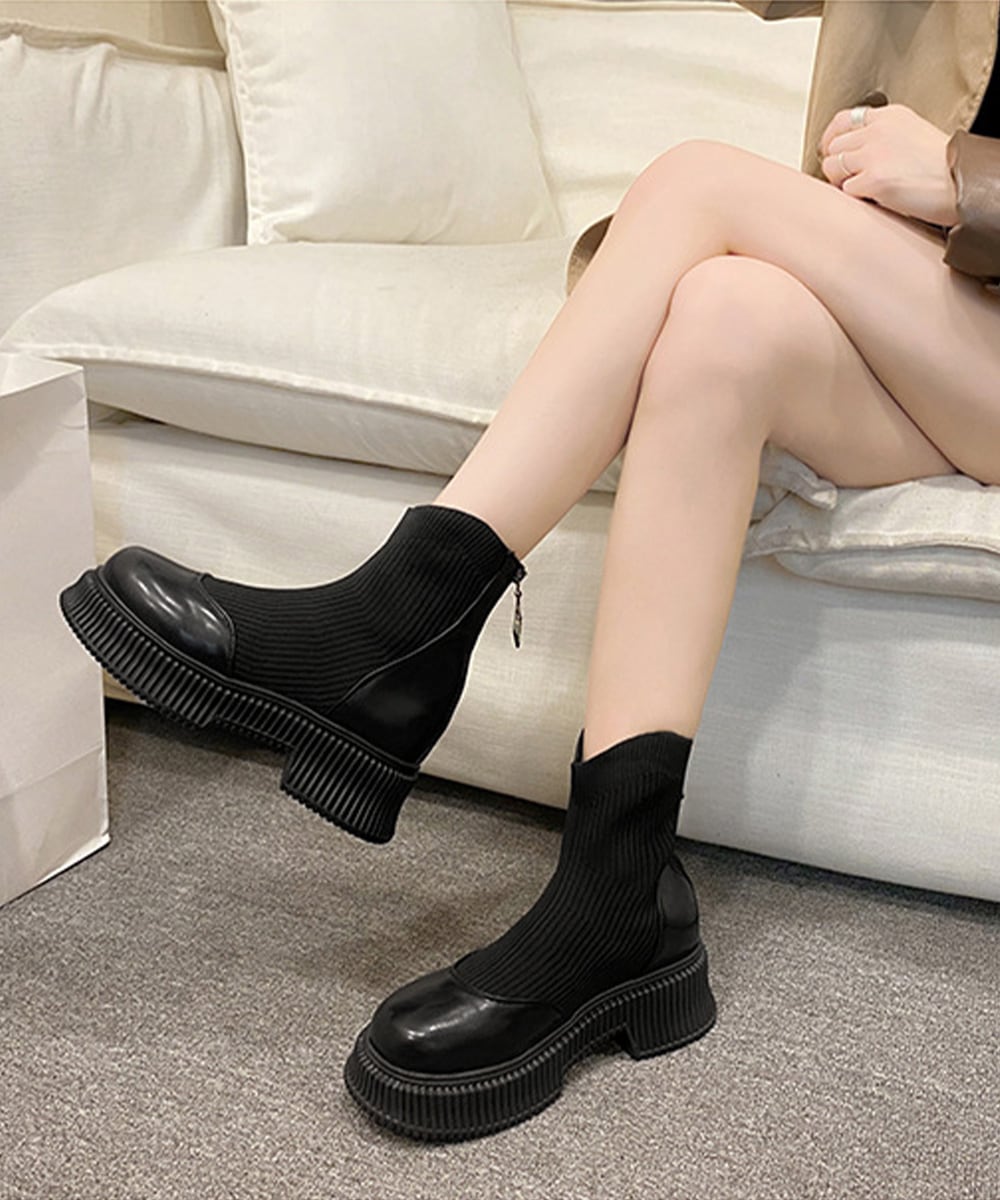 ソックスブーツ レディース 厚底 黒 ショートブーツ ニットブーツ ブーティ ローヒール 太ヒール